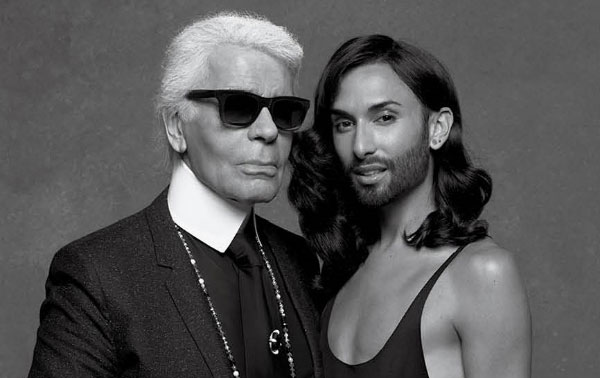 Vencedora do Eurovision, Conchita Wurst fotografa com estilista Karl Lagerfeld